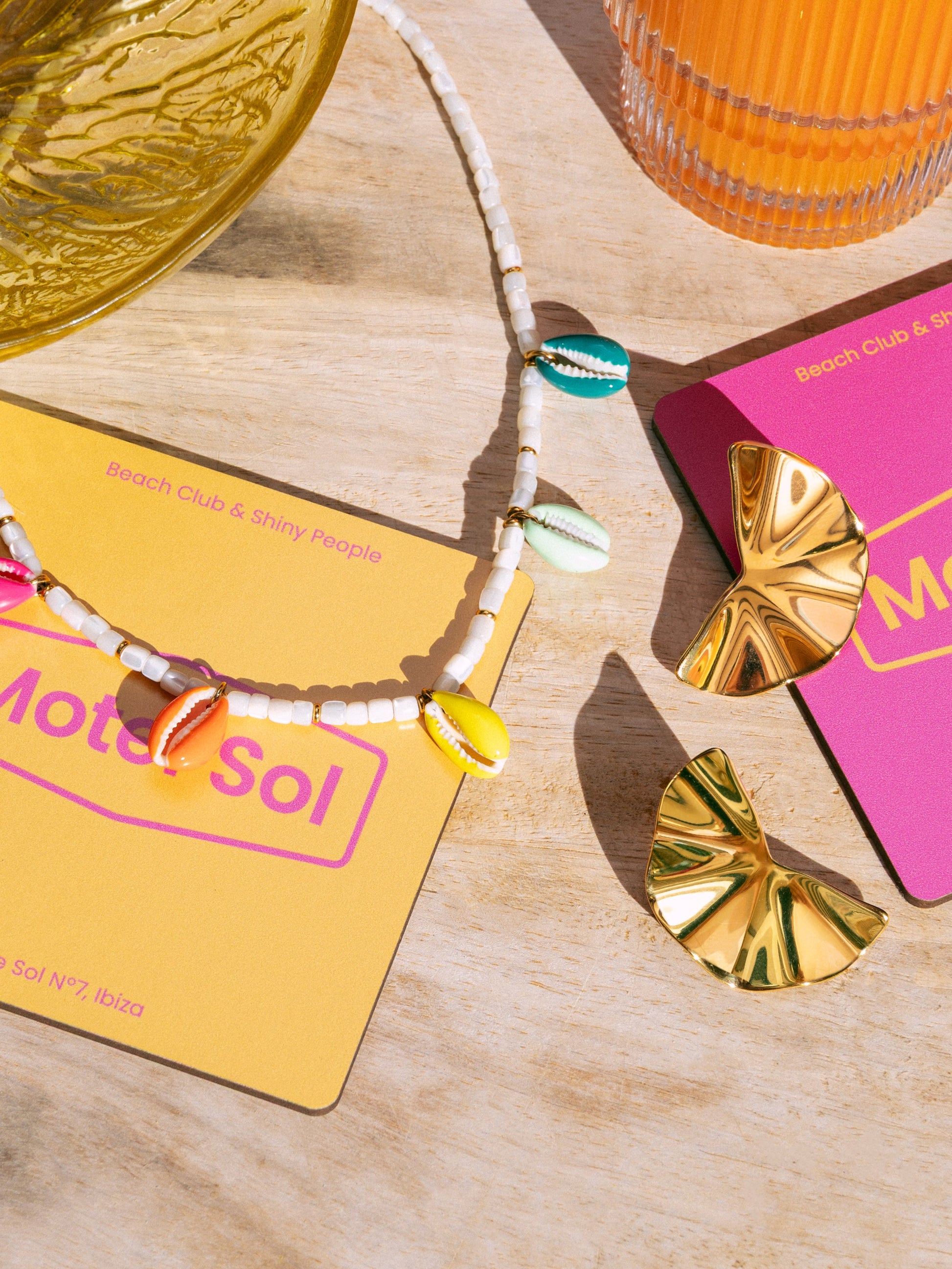 El Collar Boho Color Shells será tu próxima obsesión de verano. 🩷 Un collar con caracolas de colores que cuelgan de una cadena adornada con cuentas blancas acompañadas de unos mini dots bañados en oro✨ Es ideal para llevar con tu bikini favorito.