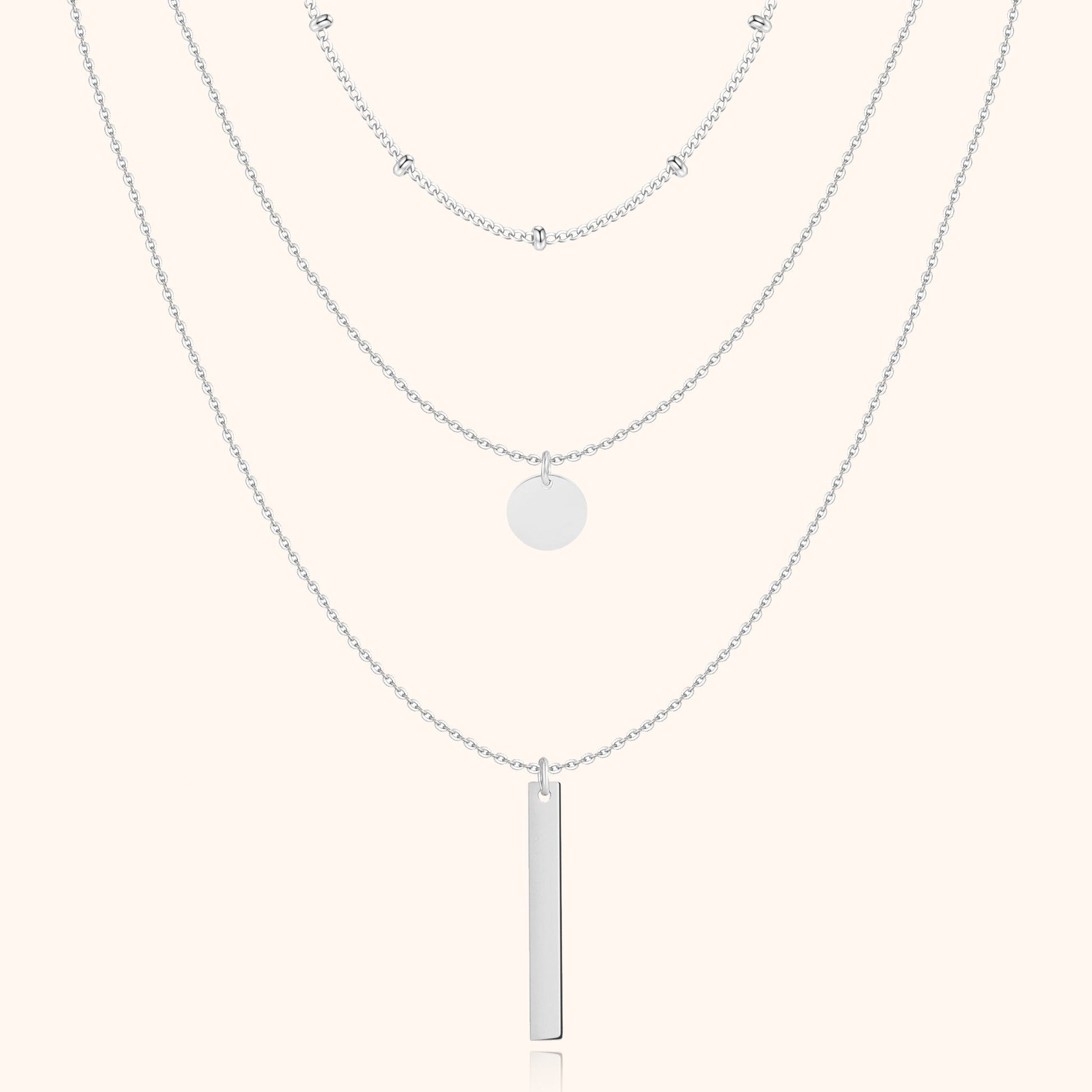 Precioso colgante triple, adornado por una barrita, un círculo y pequeñas bolitas en sus distintos niveles, formando una combinación elegante.