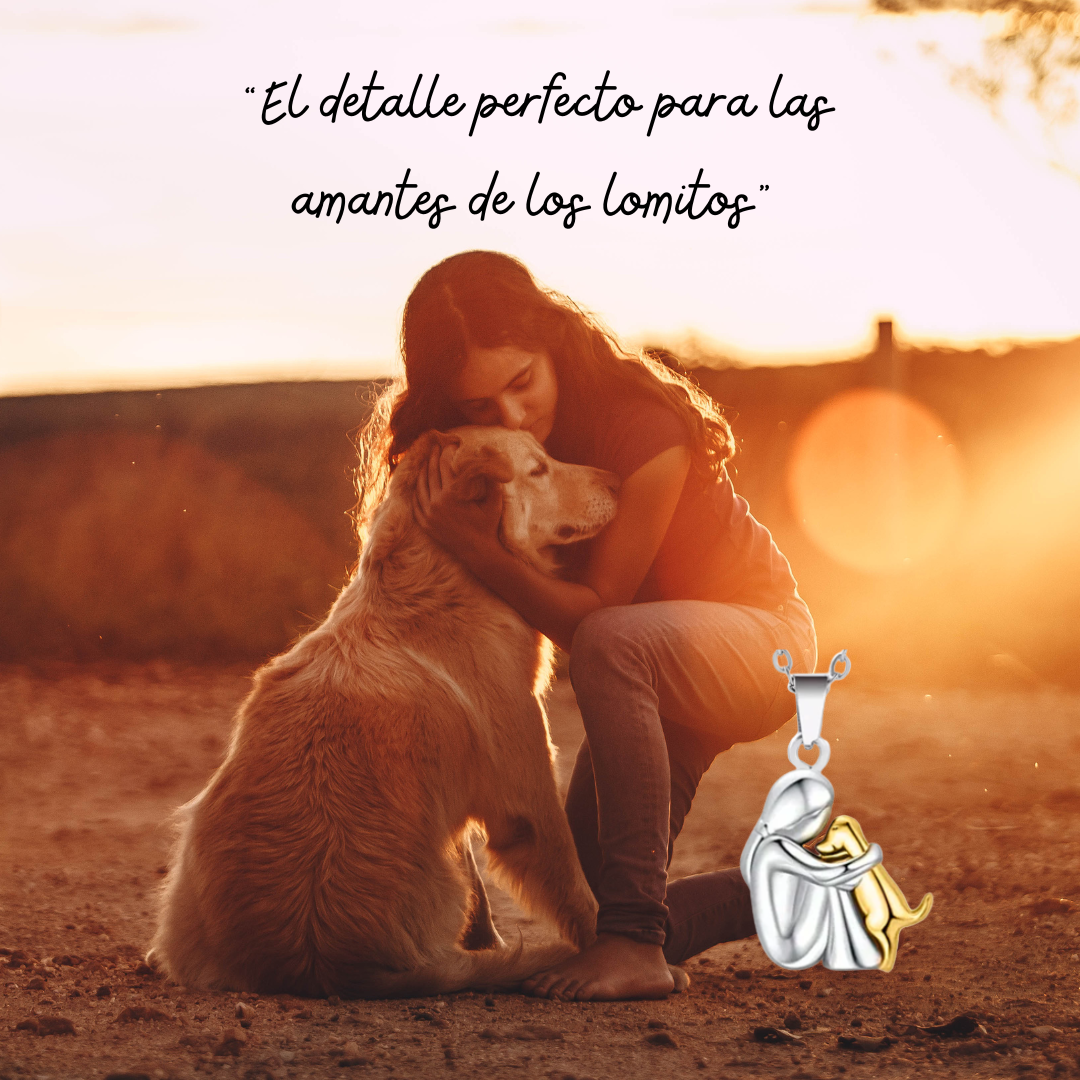 ✔ Diseño emotivo y elegante: Figura minimalista de una persona abrazando a su perro, en tonos plateado y dorado.