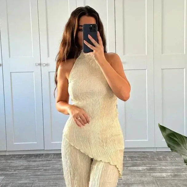 Descubre la perfecta combinación de elegancia y comodidad con el Conjunto Cristal™. Este conjunto de pantalones presenta un diseño único con cuello colgante y espalda descubierta que añade un toque de sensualidad y estilo a tu guardarropa. El traje de Top Halter Diagonal con hombros descubiertos te permite lucir sexy y sofisticada al mismo tiempo.
