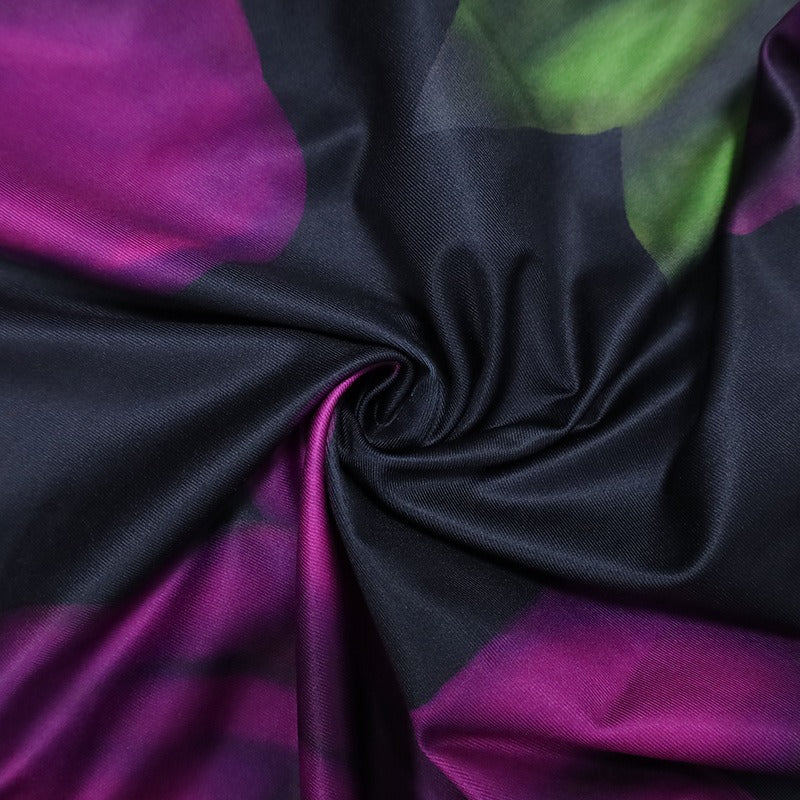 La mezcla de flores púrpura sobre fondo oscuro crea un contraste elegante y sofisticado, ideal para eventos nocturnos o cenas especiales. El corte favorecedor estiliza la figura y aporta una estética refinada con aire contemporáneo.